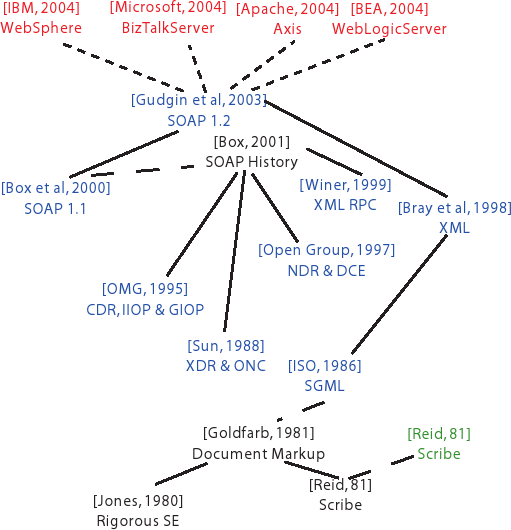 4. Промежуточное программное обеспечение для сервис-ориентированного компьютингаСо времени своего возникновения в 2000 г. технологии Web-сервисов развивались с удивительной скоростью. Ряд спецификаций, относящихся к Web-сервисам и сервис-ориентированным архитектурам (Service Oriented Architecture, SOA), уже стандартизован, и еще большее число спецификаций находится в стадии разработки. Поскольку Web-сервисы – это платформенная технология, они оказывают гигантское влияние на практику разработки программного обеспечения. Хорошее введение в технологию Web-сервисов обеспечивается в [148]. Ключевыми технологиями, лежащими в основе любых Web-сервисов, являются Simple Object Access Protocol (SOAP) [26, 62], Web Services Description Language (WSDL) [36, 35] и Business Process Execution Language (BPEL) [6]. На этих технологиях основываются большинство корпоративных сервис-ориентированных архитектур. Отследим происхождение этих технологий промежуточного программного обеспечения, но сначала кратко охарактеризуем их актуальность. Появление в 2000 г. технологий SOAP и WSDL немедленно вызвало энтузиазм. Однако, поскольку по своей природе они являлись платформенными технологиями, потребовалось несколько лет для разработки вспомогательных технологий, таких как объемистые спецификации Service Security [101], а также для получения технической зрелости и опыта для разработки распределенных приложений с использованием Web-сервисов. Современные Web-сервисы обеспечивают универсальную и общепринятую инфраструктуру для построения распределенных систем. Такая инфраструктура является незаменимой для межкорпоративной интеграции приложений. Web-сервисы теперь реализуются во всех продуктах серверов приложений, включая Microsoft BizTalk, Web Logic Server компании BEA, Websphere компании IBM, Oracle Application Server, JBoss и различные другие продукты категории open source. Результирующее воздействие Web-сервисов является гигантским. По данным компании Forrester Research, около 50% крупных предприятий уже использует SOA или будет использовать ее до конца 2006 г. [67]. Следует заметить, что технологии Web-сервисов являются не только вычислительной платформой. Они начинают изменять бизнес-модель программного обеспечения от ориентации на продажу программного обеспечения на ориентацию на продажу услуг через Web, а также и способ развития бизнеса. Поэтому воздействие Web-сервисов и SOA выходит за пределы [63, 18]. Обсудим теперь происхождение основных спецификаций, образующих основу технологии Web-сервисов. 4.1. Simple Object Access ProtocolSOAP – это стандартный формат сообщений, основанный на eXtensible Markup Language (XML). SOAP обеспечивает механизм для представления вызова объекта и его результата в XML-сообщениях, которые затем передаются с использованием основного сетевого транспортного протокола, такого как HTTP или SMTP. Таким образом, SOAP является независимым от транспортных протоколов. SOAP поддерживает два стиля передачи сообщений: RPC и документально-литеральный. На рис. 6 показаны трассы воздействий, которые привели к определению SOAP.