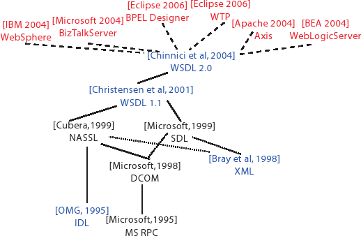 WSDL поддерживается во многих серверах приложений и средах разработки приложений. В Apache Axis обеспечивается генератор двунаправленных посредников между Java/C++ и WSDL. Большинство серверов приложений оснащается инструментальными средствами разработки Web-сервисов. Продукт IBM Rational Application Developer for WebSphere генерирует WSDL-документ на основе существующих приложений и Java-посредников на основе WSDL-документа. Microsoft Visual Studio генерирует посредников для .NET Framework на основе WSDL-документа. К числу других инструментальных средств относятся Workshop for WebLogic Platform компании BEA, Interstage Apworks компании Fujitsu и Artix компании IONA. В марте 2001 г. компании Ariba, Microsoft и IBM совместно представили в W3C записку с определением Web Services Description Language [36]. В записке говорилось, что «в этом наброске представлены текущие соображения по поводу описаний сервисов в продуктах компаний Ariba, IBM и Microsoft. В документе объединяются понятия, заложенные в NASSL, SCL и SDL (предыдущих предложениях в данной области)». Язык NASSL (Network Accessible Service Specification Language) был определен группой компонентных систем в IBM Research [41]. В техническом отчете [41] говорится, что «языки, подобные MS IDL и OMG IDL, являются популярными промышленными стандартами, используемыми для описания интерфейсов RPC. Вместо того чтобы вводить совсем другой язык, для NASSL заимствуются ключевые понятия из этих языков, и они приспосабливаются для распространения на сервисы, не относящиеся к категории RPC». К числу примеров понятий, попавших в NASSL и WSDL из языков определения интерфейсов компании Microsoft и консорциума OMG, относятся однонаправленные операции (oneway operation), семантика отказов и строгая типизация. Происхождение MS IDL и OMG IDL мы определим в разд. 7 и 8. Наиболее значительный вклад самого технического отчета по поводу NASSL состоит в предложении использовать другие системы типов, основанные на XML-схемах, для определения типов параметров и результатов Web-сервисов, которое, в конце концов, было принято для WSDL. SOAP Contract Language (SCL) и Service Description Language (SDL) были определены компанией Microsoft в 1999-2000 гг.* для поддержки модели удаленных вызовов для Component Object Model (COM) компании Microsoft, основанной на понятии Web-сервисов. Язык SDL относительно широко использовался, и его определение распространялось как часть инструментария Microsoft SOAP. Жизнь SCL длилась относительно недолго, и этот язык был довольно быстро вытеснен WSDL. Основное воздействие SDL от Microsoft на WSDL и современные Web-сервисы заключалось в возможности использования различных правил привязки для используемых транспортных протоколов. В документе по поводу SDL приводятся примеры использования в DCOM HTTP, HTTPS и варианта RPC от Microsoft. WSDL, NASSL, SDL и SCL основаны на языке XML. Первое предложение по использованию XML для представления языка определения интерфейсов для Web-сервисов появилось в записке с предложением языка Web Interface Definition Language (WIDL), опубликованной консорциумом World-Wide-Web [93]. Хотя мы не можем представить прямых доказательств того, что в WSDL, NASSL, SDL и SCL эта идея позаимствована из WIDL, по ряду причин это кажется весьма вероятным. Во-первых, определения WSDL, NASSL, SDL и SCL появились в то время, когда Microsoft и IBM очень активно участвовали в Рабочей группе по протоколам консорциума World-Wide-Web. Во-вторых, язык WIDL был представлен в виде записки в консорциум World-Wide-Web в 1997 г. Наконец, что наиболее важно, Рабочая группа по протоколам XML, которая в итоге приняла WSDL, в 2000 г. опубликовала матрицу, в котор