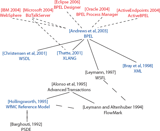 Имеется значительное число реализаций BPEL. IBM разработала BPEL4J (Business Process Execution Language for Web Services Java Run Time). В Microsoft BizTalk Server 2004 WS-BPEL транслируется в XLANG/s, а затем, для лучшей производительности, в сборочные модули .NET (.NET assemblies) с поддержанием обратной совместимости с предыдущими версиями серверов BizTalk [52]. Компания Oracle приобрела компанию Collaxa и встроила ее пакет программ для BPEL в свой продукт BPEL Process Manager, который может использоваться самостоятельно или в качестве необязательного компонента Oracle Application Server Enterprise Edition. Имеется ряд процессоров BPEL с открытыми кодами от компаний Active Endpoints, RedHat/JBoss и Apache. Поддержка графического моделирования BPEL по лицензии open source доступна благодаря проекту Eclipse BPEL Designer, совместно поддерживаемого IBM, Oracle и UCL (University College London). Первая спецификация BPEL под названием BPEL4WS (Business Process Execution Language for Web Services) была опубликована IBM и Microsoft в августе 2002 г. В спецификации BPEL4WS утверждалось, что в этом языке объединяются два более ранних языка, разработанные, соответственно, IBM и Microsoft: Web Services Flow Language (WSFL) от IBM [81] и XLANG от Microsoft [145], использовавшийся в продуктах семейства BizTalk Server. Язык WSFL возник на основе более ранней работы IBM над языком FlowMark [83, 82]. В исследовательском отчете IBM Almaden [3] утверждается соответствие FlowMark стандарту консорциума Workflow Management Coalition (WfMC): «FlowMark очень близко следует эталонной модели WfMC». Еще одним доказательством полной осведомленности группы разработчиков FlowMark о работах WfMC является тот факт, что один из основных разработчиков FlowMark Вольфганг Альтенхубер (Wolfgang Altenhuber) являлся членом технического комитета WfMC. Одним из ключевых артефактов консорциума WfMC является его эталонная модель [70]. Спецификация этой модели не включает каких-либо ссылок, но в ней утверждается, что, помимо прочего, эталонная модель происходит от «программного обеспечения поддержки проектов» («Project Support Software»). Далее говорится: «Программное обеспечение для управления проектами сложных IT-приложений (например, интегрированные среды поддержки проектов – Integrated Project Support Environments, IPSE) часто поддерживает некоторую разновидность функциональности потоков работ в среде проекта для «передачи» задач разработки между участниками проекта и маршрутизации информации между участниками для поддержки этих задач». Если бы эталонная модель была описана в какой-либо академической публикации, в ней присутствовали бы ссылки на обширные литературные источники, посвященные процессоцентричным средам разработки программного обеспечения, такие как [14]. В [92] предлагается формальное определение поведенческих аспектов BPEL с использованием многоместного π-исчисления [96]. В соответствии с [84] этот подход уже использовался в XLANG: «Наше использование ориентированных графов для моделирования потоков похоже на работы WfMC или на язык Web Services Conversation Language. Теоретическое обоснование этого подхода базируется на сетях Петри и π-исчислении. XLANG и BPML более близки к последнему формализму». 4.4. РезюмеТремя ключевыми технологиями Web-сервисов, позволяющими конструировать сервис-ориентированные архитектуры, являются SOAP, WSDL и BPEL. Мы показали, что они реализованы во многих сервис-ориентированных системах промежуточного программного обеспечения. В этих технологиях Web-сервисов используются технологии XML для определения содержимого сообщений вызовов сервисов, интерфейсов Web-сервисов и для специфи