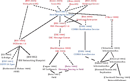6. Промежуточное программное обеспечение, ориентированное на сообщенияПромежуточное программное обеспечение, ориентированное на сообщения (message-oriented middleware, MOM), поддерживает асинхронные коммуникации между компонентами распределенных систем. Это очень важный примитив, используемый в большинстве современных серверов приложений и корпоративных сервисных шин (enterprise services bus). В J2EE имеется спецификация JMS [64]. Эта спецификация хорошо интегрирована с другими спецификациями J2EE. В частности, в спецификациях EJB, начиная в версии 1.2, определяется понятие компонентов «message beans», которые могут быть сконфигурированы таким образом, что будут вызываться при получении сообщения через JMS. В соответствии с [39], объем рынка лицензий на продукты категории MOM в 2005 г. составил миллиард долларов США, и крупнейшими поставщиками MOM являлись IBM с долей рынка в 500 миллионов США и TIBCO с долей рынка в 314 миллиона долларов США. Это составляет заметную часть всего рынка промежуточного программного обеспечения. Во время написания этой статьи наиболее значительными продуктами MOM являлись Websphere MQ компании IBM, MessageQ компании BEA, TIB/Rendevous компании Tibco, SonicMQ компании Sonic, MSMQ компании Microsoft, а также ряд продуктов с открытыми кодами, такие как JBoss Message Queue. Эти продукты как продаются изолированно, так и встраиваются в серверы приложений и корпоративные сервисные шины. Важным событием, повлиявшим на признание рынка MOM, явилась публикация спецификации JMS, созданной организацией Java Community Process. Целью этой спецификации является обеспечение единообразного API для всех ведущих поставщиков MOM. В JMS поддерживаются как двухточечные коммуникации, так и коммуникации в стиле «публикация/подписка». Поддерживаются различные варианты качества обслуживания, такие как гарантированная доставка на основе персистентного хранения сообщений при недоступности получателей. Эти понятия были придуманы не комитетом, создававшим спецификацию JMS; они использовались в продуктах MOM за многие годы до этого. Обзор различных подходов к организации MOM, включая подходы, не завоевавшие значительного коммерческого успеха, приводится в [51]. В оставшейся части этого раздела мы исследуем происхождение ключевых понятий коммерчески успешных систем [51]. Общая картина трасс воздействия в области MOM показана на рис. 12.