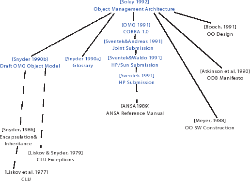 Трассы воздействий для CORBA показаны на рис. 14. Архитектура CORBA была специфицирована OMG в рамках открытого процесса. Первая спецификация CORBA является результатом деятельности двух рабочих групп, первая из которых определила объектную модель, а вторая – архитектуру брокера объектных запросов (Object Request Broker, ORB Architecture). Можно установить две основные области воздействий на первую спецификацию CORBA со стороны различных исследовательских дисциплин. Исследования в областях инженерии программного обеспечения и языков программирования воздействовали на объектную модель CORBA, а исследования в области распределенных систем – на архитектуру ORB. Ниже мы обсудим обе эти области. Очевидно, что группа, определявшая объектную модель, была осведомлена о предыдущих исследованиях и разработках в областях объектно-ориентированных языков программирования, объектно-ориентированного проектирования и объектных баз данных. На собраниях технического комитета OMG в то время происходили регулярные выступления ведущих исследователей на темы, имевшие отношение к CORBA. На собрании технического комитета в феврале 1990 г. по поводу С++ выступал Брайан Строуструп (Bjarne Stroustrop), который говорил о необходимости сосуществования и интеграции С++ с другими языками (в частности, он упоминал Smalltalk). В апреле 1990 г. выступал Клаус Дитрих (Klaus Dittrich) с рассказом об объектных моделях баз данных, в июне 1990 г. Айвар Якобсон (Ivar Jacobson) говорил про Objectory, и в октябре 1990 г. Эндрю Ватсон (Andrew Watson) рассказывал про ANSAware. Кроме того, в документе [135], определяющем объектную модель, содержится большое число ссылок на статьи, включая манифест объектных баз данных [8], на книги по объектно-ориентированному программированию, такие как [94], [77] и [40], и книги по объектно-ориентированному проектированию, включая [24] и [150]. Объектная модель была определена совместными усилиями членов одной из первых рабочих групп OMG в ходе работы по написанию «руководства по стандарту» Это руководство было отредактировано Ричардом Соли (Richard Soley), его первая версия была принята в сентябре 1990 г. и, в конце концов, оно было опубликовано в виде книги издательством John Wiley [135]. Базовая объектная модель (core object model) и глоссарий были привнесены Эланом Снайдером (Alan Snyder) [133, 132], который работал в то время в Hewlett Packard Labs. На оба эти материала, очевидно, воздействовали предыдущие исследования Снайдера. Понятие инкапсуляции и подход к поддержке множественного наследования в базовой объектной модели очень напоминают понятия, описанные в [131]. Объектная модель навязывает абстракцию данных в том смысле, что в базовой объектной модели не допускается какой-либо прямой доступ к данным; атрибуты трактуются, как пары операций доступа (одна для чтения, другая для записи), что очень близко к традициям абстракции данных в CLU [89]. Обработка исключительных ситуаций, которая добавляется к базовой модели данных в профиле объектной модели CORBA, явно внесена под воздействием более ранней работы Снайдера по управлению исключительными ситуациями в CLU [88]. После принятия объектной модели был объявлен прием предложений [147] по спецификации архитектуры брокера объектных запросов. В ответ на этот запрос консорциум OMG получил в январе 1991 г. одиннадцать конкурирующих предложений от компаний APM (Architecture Projects Management Ltd.) [68], Constellation [125], DESET [126], Hewlett Packard [91], Bull [12], HyperDesk [5], Digital 