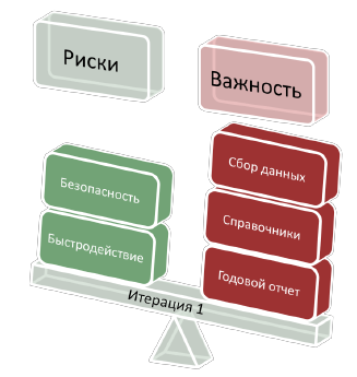 Рекомендация, планировать, что разработчики, которые назначены в ваш проект на 100% будут реально работать над вашими задачами в среднем от 24 до 32 часов в неделю. Ошибкам в оценках трудоемкости и сроков проекта и походам, которые позволяют их минимизировать, буде посвящена следующая лекция. Управление проектом, направленное на снижение рисковНа стадии инициации проекта оценка его трудоемкости имеет погрешность от -50% до +100% [4]. Это, если оценка хорошая! А если плохая, то неопределенность, а, следовательно, и риски сорвать сроки и превысить плановую трудоемкость, могут быть в разы больше. Если не прилагать специальных усилий этот «дамоклов меч» неопределенности будет висеть над проектом на всем его протяжении (Рисунок 31). Проектом следует управлять так, чтобы риски несвоевременной сдачи и перерасхода ресурсов постоянно снижались. Ранее мы уже говорили о том, что 80% ценности разработки обусловлена лишь 20% требований к продукту, без реализации которых продукт для заказчика становится просто ненужным. Остальные требования, как правило, так называемые «украшательства», от части которых заказчик, как правило, может отказаться, чтобы получить проект в срок. Поэтому следует в первую очередь реализовывать ключевые функциональные требования. Но есть и еще архитектурные риски. Известно, что закон Парето применим и к потреблению вычислительных ресурсов: 80% потребления ресурсов (время и память) приходится на 20% компонентов. Поэтому, необходимо реализовывать архитектурно-значимые требования так же в первую очередь, создавая «представительный» прототип будущей системы, который «простреливает» весь стек, применяемых технологий. Прототип позволит измерить и оценить общесистемные свойства будущего продукта: доступность, быстродействие, надежность, масштабируемость и проч. (Рисунок 32) Ошибка — реализовывать сначала легкие требования, чтобы продемонстрировать быстрый прогресс проекта.