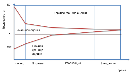 Проработка ключевых функциональных требований и детальное планирование их реализации позволяет уменьшить разброс начальных оценок, примерно, в 2 раза: от -30% до +50%. Детальное проектирование и разработка прототипа будущей системы позволит получить еще более точные оценки общей трудоемкости: от -10% до +15%. Может оказаться так, что по результатам прототипирования, уточненные оценки суммарной трудоемкости окажутся неприемлемыми. В этом случае проект придется закрыть досрочно, но потери при этом, будут значительно меньше, чем в случае, если то же самое произойдет, когда проект уже в 2 раза превысит первоначальную оценку трудоемкости. Если с заказчиком не удается найти взаимоприемлемое решение при первоначальной оценке проекта, то разумно попытаться договориться о выполнении проекта в 2 этапа с самостоятельным финансированием: