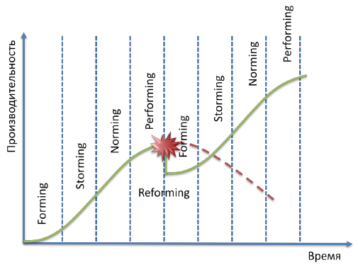 Часто случается, что рабочая группа вязнет на одной из стадий и никогда не достигает плато наивысшей производительности. Если команда прошла все стадии формирования и вышла на фазу «Performing», не стоит полагать, что менеджер проекта может делегировать все свои полномочия и отправиться в отпуск. Задача менеджера на этом этапе — «точить пилу». Это значит поддерживать требуемый уровень мотивации, быть штурманом, искать новые пути и открывать новые возможности. Постоянно наблюдать и оценивать эффективность всех процессов, применяемых в проекте. Искать ответ на вопросы: «Что угрожает проекту?» «Что лишнее мы делаем?» «Что можно делать проще?» Работать на сокращение ненужных усилий вместо того, чтобы «стремиться к новым героическим подвигам». Если руководитель не будет прилагать дополнительные усилия команда, рано или поздно, начнет «сползать» с плато наивысшей эффективности в состояние застоя и стагнации (Рисунок 42). Помните, что окружение и команда изменяются по ходу проекта. Прежняя мотивация ослабевает или перестает действовать. Изменяйте правила и процессы. Отказывайтесь от того, что перестало действовать или стало работать неэффективно. «Встряхивайте» (Reforming) и возвращайте команду в стадию «Forming». Это позволит ей снова, пройдя через все этапы становления, выйти на новый более высокий уровень производительности. Разумеется, делать это следует, после сдачи очередного релиза программного продукта, ну и, возможно, в случае глубокого кризиса проекта.