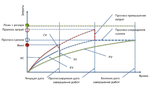 Например, если мы для того что сократить время работ по проекту работали 25% времени сверхурочно и в выходные дни с двойной оплатой, то фактические трудозатраты составили: AC = 20 * (30 * 1000 + 10 * 2000) = 1 000 000 руб. Поэтому отклонения по затратам в нашем случае будет CV = EV - AC PV = 800 000 - 1 000 000 = - 200 000 руб. Отрицательное значение отклонения по затратам означает, что мы превысили бюджет, что, в общем случае, не очень хорошо. Но если срок завершения проекта для нас имеет высший приоритет, и наши прогнозируемые затраты по завершению проекта не превышают плановых с учетом управленческого резерва (Рисунок 43), то в этом случае можно считать, что проект выполняется успешно.