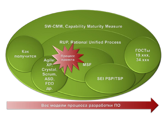 Лекции по управлению программными проектамиМодели процесса разработки ПОМодели (или, как еще любят говорить, методологии) процессов разработки ПО принято классифицировать по «весу» — количеству формализованных процессов (большинство процессов или только основные) и детальности их регламентации. Чем больше процессов документировано, чем более детально они описаны, тем больше «вес» модели. Наиболее распространенные современные модели процесса разработки ПО представлены на Рисунке 3.