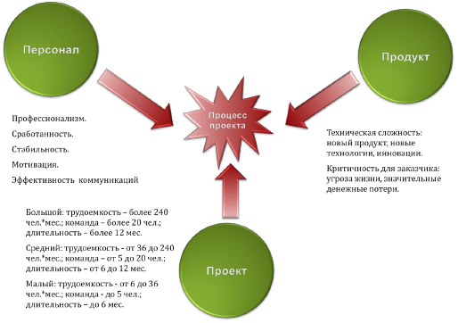 Это означает, что не существует единственного правильного процесса разработки ПО, в каждом новом проекте процесс должен определяться каждый раз заново, в зависимости от проекта, продукта и персонала, в соответствие с «Законом 4-х П» (Рисунок 4). Совершенно разные процессы должны применяться в проектах, в которых участвуют 5 человек, и в проектах, в которых участвуют 500 человек. Если продуктом проекта является критическое ПО, например, система управления атомной электростанцией, то процесс разработки должен сильно отличаться от разработки, например, сайта «отдохни.ру». И, наконец, по-разному следует организовывать процесс разработки в команде вчерашних студентов и в команде состоявшихся профессионалов.