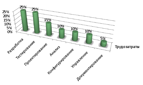Специфика программного проекта заключается в том, что людские ресурсы вносят основной вклад в его стоимость. Все остальные затраты, как правило, незначительны, по сравнению с этим расходами. О том, как следует подходить к оценкам трудозатрат на реализацию проекта разработки ПО, мы будем подробно говорить в следующих лекциях. На фазе инициации хорошей считается оценка трудозатрат с точностью от -50% до +100% [2]. Необходимо помнить, что помимо непосредственно программирования в проекте разработки ПО есть много других процессов, которые требуют ресурсы соответствующей квалификации, а само программирование составляет лишь четверть всех затрат. Распределение трудозатрат по основным производственным процессам при современном процессе разработки ПО выглядит в среднем следующим образом: