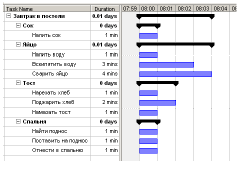 Эти вопросы будут рассмотрены далее в специальных лекциях. Базовое расписание проектаПосле определения трудоемкости работ необходимо определить график их выполнения и общие сроки реализации проекта — составить расписание работ по проекту. Базовое расписание — утвержденный план-график с указанными временными фазами проекта, контрольными точками и элементами иерархической структуры работ. Базовое расписание может быть наиболее наглядно представлено диаграммой Ганта. В этой диаграмме плановые операции или элементы иерархической структуры работ перечислены с левой стороны, даты отображаются сверху, а длительность операций показана горизонтальными полосками от даты начала до даты завершения. Базовое расписание это, как правило, элемент контракта с заказчиком. Контрольные точки (вехи) должны служить точками анализа состояния проекта и принятия решения «GO/NOT GO», поэтому они должны зримо демонстрировать статус проекта. Контрольная точка «Проектирование завершено» — плохо. Наиболее эффективный подход — метод последовательных поставок: контрольная точка «Завершено тестирование требований 1, 3, 5, 7» Если работы не связаны между собой, то любую из них мы можем начинать и завершать, когда нам удобно. Все работы можно делать параллельно и в этом случае минимальная длительность проекта равна длительности самой долгой работы. Однако, на практике между работами существуют зависимости, которые могут быть «жесткими», например, анализ — проектирование — кодирование — тестирование и документирование конкретной функции; или «нежесткими», которые могут пересматриваться или смягчаться. Например, последовательное выполнение задач конкретным исполнителем (можно перепланировать на другого исполнителя) или разработка базового ПО, которая должна предшествовать разработке прикладного ПО. В этом случае можно создавать «заглушки» эмулирующие работу базового ПО. Таким образом, диаграмма Ганта для расписания проекта выглядит как гамак, составленный из множества цепочек взаимосвязанных работ с единой точкой начала и завершения. Критический путь проекта (Critical path) — самая длинная цепочка работ в проекте. Увеличение длительности любой работы в этой цепочки приводит к увеличению длительности всего проекта. В проекте всегда существует хотя бы один критический путь, но их может быть несколько. Критический путь может меняться во время исполнения проекта. При исполнении проекта руководитель должен обращать внимание на исполнение задач на критическом пути в первую очередь и следить за появлением других критических путей. Практическая рекомендация: на критическом пути должны стоять работы с нежесткими связями, которые всегда можно перепланировать, если возникает угроза срыва сроков. Чтобы проиллюстрировать понятие критического пути рассмотрим пример «суперпроекта»5. Концепция проекта выглядит следующим образом. Цель проекта. Сделать завтрак в постель Результаты проекта. Завтрак в постели из вареного яйца, тоста и апельсинового сока. Ресурсы. Имеется один оператор и обычное кухонное оборудование. Сроки. Проект начинается на кухне в 8:00 и завершается в спальне. Критерий приемки. Используются минимальные трудовые ресурсы и срок. Конечный продукт имеет высокое качество: яйцо свежесваренное, тост теплый, сок холодный. Обоснование п