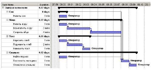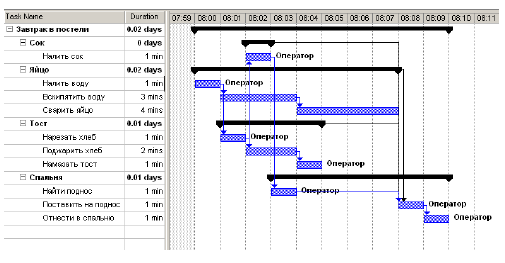 На следующем шаги мы должны учесть зависимости между работами, например, нельзя жарить хлеб, пока мы его не нарезали. С учетом зависимостей мы получим следующую диаграмму расписания нашего проекта (Рисунок 19)