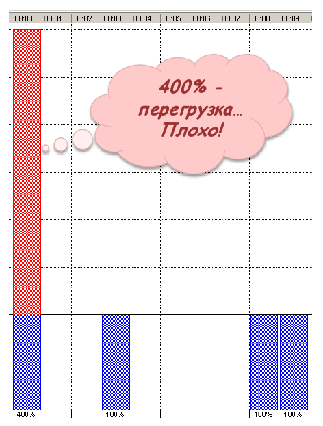 В результате мы определили, что минимальный срок реализации нашего проекта составляет 10 минут. Однако мы не можем на этом остановиться, поскольку должны еще учесть ограничение по ресурсам. У нас только один оператор. Если мы посмотрим на диаграмму загруженности ресурсов (Рисунок 20), то увидим, что наш критический ресурс загружен на первой минуте на 400%. что недопустимо.