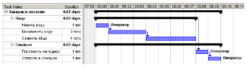 Теперь диаграмма загруженности ресурсов (Рисунок 23) выглядит приемлемо и у оператора даже появилось три минуты свободного времени на перекур. При этом общая длительность реализации проекта по-прежнему составляет 10 минут.