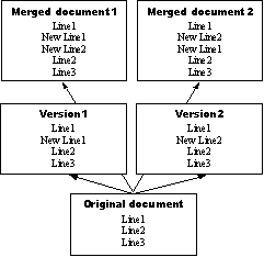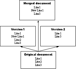 Рис. 1. Пример консолидации изменений в итоговом текстовом документе Например, если при одновременной модификации текстового файла в ходе выполнения одной транзакции была вставлена новая строка, а в ходе выполнения другой транзакции одна из строк была удалена, результатом консолидации изменений должен стать итоговый документ с внесенными общими изменениями (см. рис. 1), дополняющий его существующие версии новым согласованным вариантом. Корректная идентификация изменений и реализация функции