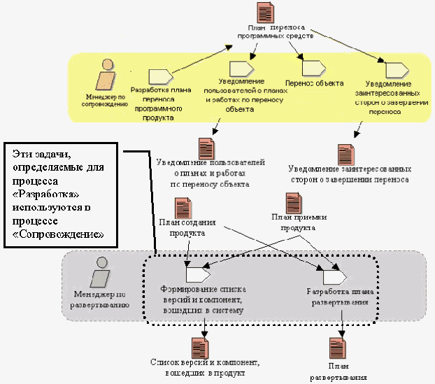Взаимодействие с другими процессами ЖЦ ПСПроцесс сопровождения выполняется на всех стадиях ЖЦ ПС, поэтому важную роль играет правильное определение его взаимодействия с остальными процессами ЖЦ ПС. В частности, многие задачи, которые требуется выполнять в процессе сопровождения, относятся к другим процессам. Обычно это вспомогательные процессы ЖЦ ПС такие как управление конфигурацией и обеспечение качества. В этом случае возможны два варианта определения таких задач: