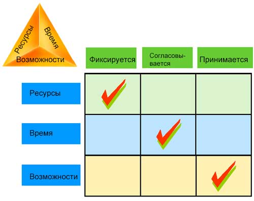 Билл Гейтс. «Бизнес со скоростью мысли» 2.1. Единое видение проектаЛюбой коллективный труд, а тем более такой нетривиальный как разработка и внедрения программного обеспечения, имеет мало шансов на успех, если все участвующие стороны не представляют (или еще хуже не правильно представляют) конечной цели проекта, иначе говоря, не имеют единого видения (shared vision) проекта. Все заинтересованные лица и просто участники проекта должны чётко представлять конечный результат. Всем должна быть понятна цель проекта. Подход MSF не зря акцентирует внимание на этом, казалось бы, умозрительном принципе. На практике не всегда так просто обеспечить единое понимание целей и задач проекта. Зачастую эта единая цель вступает в противоречие с интересами некоторых участников проекта. Или эти участники видят выгоды только от одной подсистемы проекта, которая касается их непосредственно. Например, бывает очень тяжело на последних этапах проекта объяснить сотрудникам склада, зачем им вводить номер накладной на отпущенный товар. Им он не нужен. Зато он нужен бухгалтерии. Конфликт возникает, потому что кладовщики думали, что автоматизируют склад, а не предприятие в целом. Поэтому MSF выделяет в жизненном цикле проекта целую фазу для обеспечения единого видения проекта. 2.2. Управляйте компромиссамиНаверное, не было еще ни одного менеджера проекта, которому не приходилось бы бороться с разрастанием рамок проекта и, как следствие, с перерасходом средств и затягиванием сдачи. Настоящим искусством менеджера является элегантное нахождение компромисса между ресурсами проекта (людскими, финансовыми и пр.), календарным графиком (временем) и реализуемыми возможностями (рамками). 2.2.1. Треугольник компромиссовЧасто бывает очень полезно изобразить эту зависимость заказчику в виде треугольника компромиссов ![]() После достижения утвержденного равновесия с заказчиком, т.е. на запрашиваемые возможности вы назвали и зафиксировали сроки и смету, любое изменение на одной из сторон треугольника влечет изменение на двух оставшихся. Такой подход служит удобным инструментом для нахождения компромиссов с заказчиком и поможет объяснить суть имеющихся ограничений. Иногда имеет смысл добавлять еще четвертое измерение – качество, за счёт которого можно сэкономить время и ресурсы при неизменных возможностях, хотя, на мой взгляд, это последнее на чём стоит экономить. Однако отечественные реалии диктуют свои законы и не редки случаи, когда важен сам факт внедрения и заниженная планка качества решения (quality bar) всех устраивает. В таких случаях участники проекта должны, по крайней мере, знать об этом, и этот факт должен найти адекватное отражение в проектной документации (например, отсутствие дизайнерского оформления интерфейса или ведения журнала операций пользователя в системе). 2.2.2. Матрица компромиссовДля эффективного достижения компромиссов в течение всего жизненного цикла проекта, MSF рекомендует на начальных этапах зафиксировать приоритеты факторов проекта (ресурсы, время, возможности). На один из факторов влиять в течение проекта будет практически невозможно (Фиксируется), - другой будет обладать некоторым приоритетом при разрешении компромиссов (Согласовывается) и оставшийся будет принят в соответствии с первыми двумя (Принимается). ![]() Зафиксировать приоритеты в