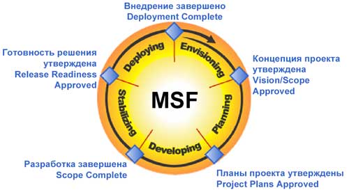 Корпорацию Майкрософт можно обвинять в чём угодно, но уж точно не в том, что её руководители не умеют вести бизнес и создавать продаваемые программные комплексы. Посредством пакета руководств MSF (Microsoft Solutions Framework) гигант IT индустрии решил поделиться опытом и накопленной информацией в области проектирования, разработки, внедрения и сопровождения IT -проектов. Словосочетание MSF я бы перевёл как «Подходы Майкрософт к созданию решений». База знаний MSF состоит из оригинальных моделей, методов и взглядов на такие области знаний как управление проектами, персоналом, планирование, анализ рисков и другие смежные дисциплины. Нельзя сказать, что MSF очередной чисто теоретический взгляд на управление. В руководствах по MSF кроме методов, моделей и концепций встречаются практические советы и приёмы, отнюдь не лишенные рациональности. Структурно пакет руководств MSF разделён на пять документов, так называемых «белых книг», каждый из которых охватывает определенную дисциплину или модель MSF : «Модель процессов MSF», «Модель проектной группы MSF», «Дисциплина управления проектами MSF», «Дисциплина управления рисками MSF» и «Дисциплина управления подготовкой MSF». Эта статья посвящена в большей степени первой книге «Модель процессов MSF», в которой будет рассмотрена модель жизненного цикла IT -проекта, а также базисные концепции и принципы методологии MSF. Предметной областью рассматриваемой методологии является IT -проект (разработка ПО, внедрение/адаптация уже разработанных систем, разворачивание сетевой инфраструктуры или всё вышеперечисленное в комплексе). На мой взгляд, возможность применения данной технологии возникает в любом проекте, в котором задействовано более 4-6 человек. Итак, на чём же зиждется успех гиганта? 2. Базовые концепции и принципы модели процессов MSF