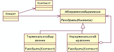 Задача поиска строк по образцу может быть решена посредством создания интерпретатора, определяющего грамматику языка. "Клиент" строит предложение в виде абстрактного синтаксического дерева, в узлах которого находятся объекты классов "НетерминальноеВыражение" и "ТерминальноеВыражение" (рекурсивное), затем "Клиент" инициализирует контекст и вызывает операцию Разобрать(Контекст). На каждом узле типа "НетерминальноеВыражение" определяется операция Разобрать для каждого подвыражения. Для класса "ТерминальноеВыражение" операция Разобрать определяет базу рекурсии. "АбстрактноеВыражение" определяет абстрактную операцию Разобрать, общую для всех узлов в абстрактном синтаксическом дереве. "Контекст" содержит информацию, глобальную по отношению к интерпретатору.