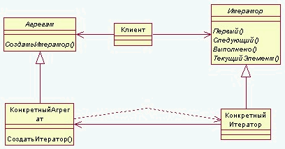 Создается класс "Итератор", коорый определяет интерфейс для доступа и перебора элементов, "КонкретныйИтератор" реализует интерфейскласса "Итератор" и следит за текущей позицией при обходе "Агрегата". "Агрегат" определяет интерфейс для создания объекта - итератора. "КонкретныйАгрегат" реализует интерфейс создания итератора и возвращает экземпляр класса "КонкретныйИтератор", "КонкретныйИтератор" отслеживает текущий объект в агрегате и может вычислить следующий объект при переборе.