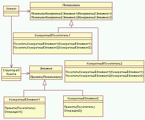 Класс "КонкретныйПосетитель"предоставляет контекст для этого алгоритма и сохраняет его локальное состояние. "Элемент" определяет операцию "Принять", которая принимает "Посетителя" в качестве аргумента, "КонкретныйЭлемент" реализует операцию "Принять", которая принимает "Посетителя" в качестве аргумента. "СтруктураОбьекта" может перечислить свои аргументы и предоставить посетителю высокоуровневый интерфейс для посещения своих элементов.
