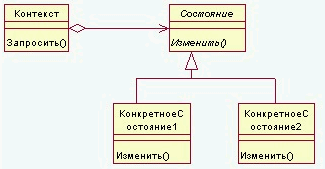 Класс "Контекст" делегирует зависящие от состояния запросы текущему объекту "КонкретноеСостояние" (хранит экземпляр подкласса "КонкретноеСостояние", которым определяется текущее состояние), и определяет интерфейс, представляющий интерес для клиентов. "КонкретноеСостояние" реализует поведение, ассоциированное с неким состоянием объекта "Контекст". "Состояние" определяет интерфейс для инкапсуляции поведения, ассоциированного с конкретным экземпляром "Контекста".
