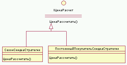Создается несколько классов "Стратегия", каждый из которых содержит один и тот же полиморфный метод "ЦенаРассчитать". В качестве параметров в этот метод передаются данные о продаже. Объект стратегии связывается с контекстным объектом (тем объектом, к которому применяется алгоритм). |