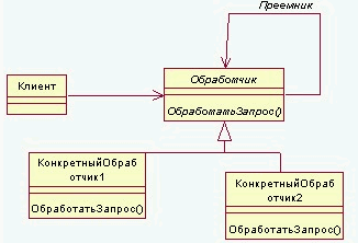 Связать объекты - получатели запроса в цепочку и передать запрос вдоль этой цепочки, пока он не будет обработан. "Обработчик" определяет интерфейс для обработки запросов, и, возможно, реализует связь с преемником, "КонкретныйОбработчик" обрабатывает запрос, за который отвечает, имеет доступ к своему преемнику ("КонкретныйОбработчик" направляет запрос к своему преемнику, если не может обработать запрос сам.