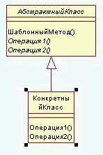 "АбстрактныйКласс" определяет абстрактные Операции(), замещаемые в конкретных подклассах для реализации шагов алгоритма, и реализует ШаблонныйМетод(), определяющий "скелет" алгоритма. "КонкретныйКласс" релизует Операции(), выполняющие шаги алгоритма способом, который зависит от подкласса. "КонкретныйКласс" предполагает, что инвариантные шаги алгоритма будут выполнены в "АбстрактномКлассе".