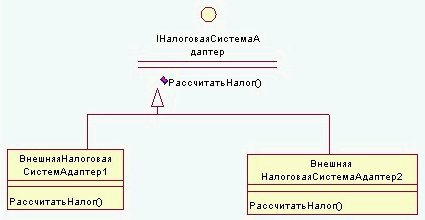 Интеграция разрабатываемой системы с различными внешними системами учета налогов. Используются локальные программные объекты, обеспечивающие адаптацию (Адаптеры), при отправке сообщения к такому объекту выполняется обращение к внешней системе с использованием ее собственного программного интерфейса.