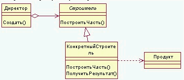 Объект "Строитель" предоставляет объекту "Директор" абстрактный интерфейс для конструирования "Продукта", за которым может скрыть представление и внутреннюю структуру продукта, и , кроме того, процесс сборки "продукта". Для изменения внутреннего представления "Продукта" достаточно определить новый вид "Строителя". Данный паттерн изолирует код, реализующий создание объекта и его представление. |