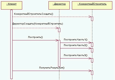 "Клиент" создает объект - распорядитель "Директор" и конфигурирует его объектом - "Строителем". "Директор" уведомляет "Строителя" о том, что нужно построить очередную часть "Продукта". "Строитель" обрабатывает запросы "Директора" и добавляет новые части к "Продукту", затем "Клиент" забирает "Продукт" у "Строителя".