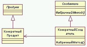 Абстрактный класс "Создатель" объявляет ФабричныйМетод, возвращающий объект типа "Продукт" (абстрактный класс, определяющий интерфейс обьектов, создаваемых фабричным методом). "Создатель также может определить реализацию по умолчанию ФабричногоМетода, который возвращает "КонкретныйПродукт". "КонкретныйСоздатель" замещает ФабричныйМетод, возвращающий объект "КонкретныйПродукт". "Создатель" "полагается" на свои подклассы в определении ФабричногоМетода, возвращающего объект "КонкретныйПродукт".