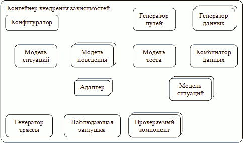 Основой инструментария тестирования на основе моделей предлагается сделать контейнер внедрения зависимостей (dependency injection container), позволяющий задавать список компонентов, входящих в систему, инициализировать их состояние и определять связи между ними внешним образом, без вмешательства в код этих компонентов.