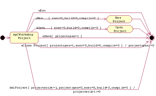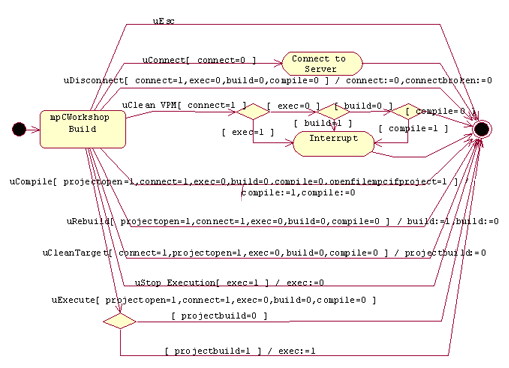 Для тестирования базовой функциональности была составлена базовая диаграмма состояний и переходов mpC Workshop. Ниже приведены фрагменты это диаграммы (включая поддиаграммы). Главная диаграмма выглядит следующим образом: