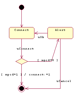 Такой язык был выбран из-за простоты интерпретации, что упростило написание интерпретатора. Но, как оказалось, перечисленных возможностей вполне достаточно для описания большинства возможностей графического интерфейса. Ниже приведён пример диаграммы состояний с двумя переменными и одной поддиаграммой. ![]() Поддиаграмма главной диаграммы, связанная с объектом типа Activity ‘Connect to Server’: ![]() В этом примере используются две переменных – 'server' и ‘connect’. Значение переменной 'server' определяет состояние сервера (значение "1" означает, что сервер запущен, значение "0" означает, что сервер не запущен), а переменная 'connect' определяет наличие соединения с сервером (значение "1" означает, что есть соединение с сервером, а значение "0" означает, что соединения с сервером нет). Соответственно, интерпретировать эту диаграмму следует так: