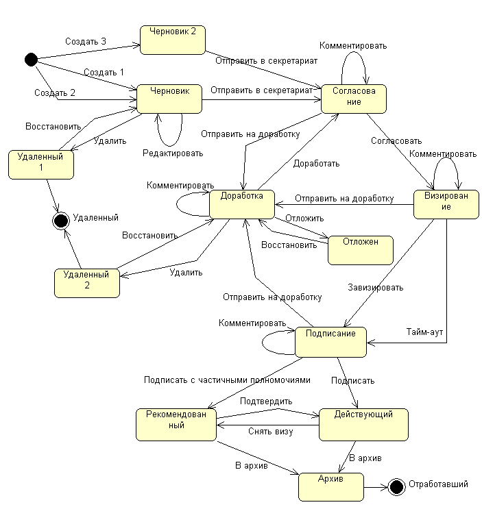 Предполагается, что при тестировании мы имеем возможность входить в систему документооборота в любой определённой в её спецификации роли, проверять возможность или невозможность осуществления воздействий данной ролью, а также осуществлять над документом любое описанное в спецификации воздействие. В противном случае соответствующие роли и воздействия исключаются из используемой для тестирования модели документа. Входными данными задачи тестирования документооборота являются список ролей пользователей системы и описание жизненного цикла (ЖЦ) документа. Описание ЖЦ представляется в виде графа состояний Конечного Автомата (КА), начальное состояние которого соответствует началу ЖЦ, переходы из начального состояния различным способам создания документа данного типа, конечное состояние (их может быть несколько) завершению ЖЦ, прочие состояния промежуточным состояниям документа, а переходы воздействиям на документ. Если воздействие относится к первому классу, то соответствующий переход КА помечен списком ролей, которым разрешено выполнять соответствующее воздействие. В используемой нами модели также предусмотрена возможность пометить некоторые воздействия (желательно, но не обязательно оставляющие документ в том же состоянии), которые мы считаем надёжными или по каким-то другим причинам не хотим тестировать. Например, редактирование текста документа, которое доступно (возможно, не всем ролям) практически в любом состоянии документа и не переводит притом его в другое состояние. Для таких воздействий мы проверяем возможность их осуществления, но не выполняем их в ходе теста. Используя такую модель, мы получаем возможность использовать для тестирования систем документооборота методы тестирования КА, адаптированные к особенностям предметной области. В выбранном нами методе тестирования каждый тест описывает ЖЦ некоторого документа от создания до уничтожения и, соответственно, моделируется некоторым маршрутом по графу состояний модельного КА, ведущим из начального его состояния в конечное. 3. Тестовые проверкиВ первую очередь тестируется живучесть системы документооборота и её способность выполнять заявленные воздействия. Проверяется, что система не завершает аварийно работу при выполнении осуществляемых над документом воздействий. Поскольку спецификация ЖЦ документа представлена в виде графа состояний, при тестировании мы проверяем изоморфизм наблюдаемого графа состояний документа модельному графу. Для этого в каждом состоянии мы проверяем список доступных в нём воздействий (соответствующих переходам из состояния), а после выполнения каждого тестового воздействия проверяем, соответствует ли полученное состояние документа ожидаемому. Расхождение между ожидаемым и полученным состоянием считается ошибкой и требует исправления тестируемой системы или пересмотра спецификации. Согласно используемой модели некоторые воздействия могут быть выполнены только определёнными ролями; для тестирования этого требования мы проверяем соответствие между ролями и доступными им воздействиями. Обнаруженная в ходе тестирования невозможность осуществить некоторой ролью воздействие, которое описано в спецификации как возможное для неё, равно как и наоборот, считается ошибкой. Другие проверки в данную моде
