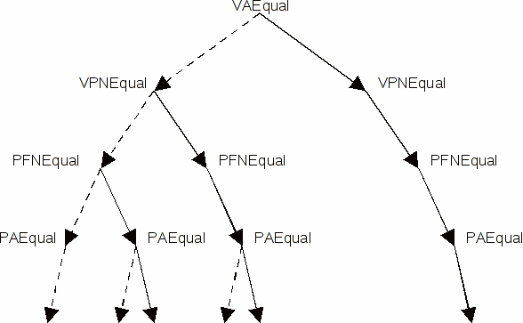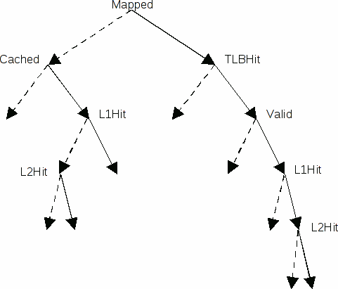 В силу иерархической организации памяти зависимости по адресам имеют многоуровневую структуру. Фрагмент дерева возможных зависимостей представлен на рисунке 2 (пунктирная дуга соответствует значению false, сплошная — значению true). Результирующая зависимость между инструкциями соответствует пути от корня до листовой вершины.