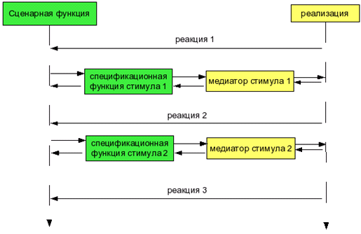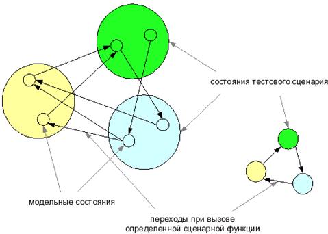 Рис. 4. Исполнение сценарной функции Рис. 5. Один из сценариев сериализации В процессе проверки одного из порядков сериализации тестовый сценарий может проходить через последовательность состояний модели. Такие промежуточные состояния называются нестационарными. Вызов сценарной функции должен обязательно закончиться в стационарном состоянии, иначе поведение целевой системы является некорректным. Кроме того, все допустимые последовательности сериализации, которые заканчиваются в стационарном состоянии, должны приводить к одному и тому же состоянию. Иначе выполнение тестового сценария будет прервано с сообщением об ошибке. В функциях, выполняющих сериализацию, используются методы сохранения состояния модели, восстановления состояния модели, а также определения, является ли данное состояние стационарным. Если имеется информация о частичном порядке вызовов стимулов и поступления реакций, то можно существенно сократить процесс сериализации по сравнению с полным перебором или даже свести ее к рассмотрению одного единственного варианта. В инструменте CTesK предусмотрены средства для разбиения множества модельных состояний на группы. Такое разбиение называется факторизацией состояний, а полученные обобщенные состояния - состояниями тестового сценария. На выбор факторизации накладывается следующее ограничение: после вызова определенной сценарной функции из определенного начального состояния тестового сценария тестовый сценарий всегда должен перейти в одно и то же конечное состояние. Пример факторизации модельных состояний схематично представлен на Рис. 6.