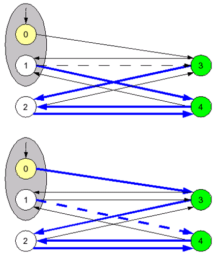 Рис. 7. Пример графа состояний тестового сценария Этот пример показывает, что граф состояний тестового сценария не является сильно связным, так как нет дуги, которая возвращала бы тестовый сценарий в начальное состояние. Однако такая дуга необходима для осуществления обходчиком всех возможных переводов мобильного узла из всех достижимых состояний. Это одна из проблем, возникающих при использовании состояний, принятых в нашем подходе. Для гарантированного приведения тестируемой реализации в первоначальное состояние перед выполнением очередного тестового сценария используется перезагрузка целевого узла. Чтобы решить проблему с несвязностью графа состояний, можно было бы ввести стимул, осуществляющий перезагрузку системы, но это приводило бы к большому количеству перезагрузок во время тестирования и заняло бы больше времени на исполнение теста. Кроме того, сложно было бы отследить, чем именно вызвана перезагрузка: нестабильностью тестируемой реализации или воздействием такого стимула. Вместо введения стимула, осуществляющего перезагрузку целевой реализации, в предлагаемом подходе используются два приема: объединение состояний и обеспечение всех возможных воздействий. А именно, начальное состояние мобильного узла объединяется с состоянием «мобильный узел в домашней сети», в которое он попадает после возвращения в домашнюю сеть, при условии, что тестовый сценарий отправит все необходимые сообщения от имени узлов виртуальной сети. Для обеспечения же перебора всех возможных воздействий в начальном состоянии первоначальные тестовые сценарии разделяются на несколько подсценариев. Этот процесс можно описать следующим образом. Сначала, как и обычно, для проверки определенных групп требований стандарта разрабатываются конкретные тестовые сценарии. Затем после определения всех возможных стимулов, необходимых для обеспечения полноты тестирования, для каждого из этих первоначально разработанных тестовых сценариев создается несколько подсценариев, которые отличаются лишь тем, что на целевую реализацию, находящуюся в первоначальном состоянии, осуществляется воздействие одним конкретным стимулом, отличным от первых стимулов в других подсценариях. При этом общее количество создаваемых подсценариев равно количеству возможных стимулов для данного тестового сценария. Таким образом, на реализацию, находящуюся в первоначальном состоянии, осуществляется воздействие всеми возможными стимулами. На Рис. 8 изображены подсценарии, полученные из предыдущего примера при помощи описанных выше действий. Заметим, что у этого графа дуга из состояния 1 в состояние 3, соответствующая первому способу перевода мобильного узла из домашней сети во внешнюю сеть, обозначена пунктиром. Это означает, что обходчик не обязан осуществлять такое воздействие, так как может считать, что оно уже произведено при выполнении перевода мобильного узла из начального состояния первым способом. По этой же причине во втором подсценарии выделена пунктиром дуга из состояния 1 в состояние 4, соответствующая второму способу перевода мобильного узла из домашней сети во внешнюю сеть. Из-за подобных особенностей полученных подсценариев в случае, когда первоначальный тестовый сценарий включает в себя лишь одно воздействие, и, соответственно, имеется