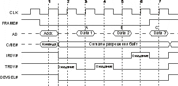 В каждый момент времени шиной может управлять только одно ведущее устройство, получившее на это право от арбитра. Каждое ведущее устройство имеет пару сигналов — REQ# для запроса на управление шиной и GNT# для подтверждения предоставления управления шиной. Устройство может начинать транзакцию (устанавливать сигнал FRAME#) только при активном полученном сигнале GNT#. Снятие сигнала GNT# не позволяет устройству начать следующую транзакцию, а при определенных условиях (см. ниже) заставляет прекратить начатую транзакцию. Арбитражем запросов на использование шины занимается специальный узел, входящий в чипсет системной платы. Схема приоритетов (фиксированный, циклический, комбинированный) определяется программированием арбитра. Для адреса и данных используются общие мультиплексированные линии AD. Четыре мультиплексированные линии C/BE[3:0] обеспечивают кодирование команд в фазе адреса и разрешения байт в фазе данных. В начале транзакции ведущее устройство активизирует сигнал FRAME#, по шине AD передает целевой адрес, а по линиям C/BE# — информацию о типе транзакции (команде). Адресованное ЦУ отзывается сигналом DEVSEL#. Ведущее устройство указывает на свою готовность к обмену данными сигналом IRDY#, эта готовность может быть выставлена и раньше получения DEVSEL#. Когда к обмену данными будет готово и ЦУ, оно установит сигнал TRDY#. Данные по шине AD передаются только при одновременном наличии сигналов IRDY# и TRDY#. С помощью этих сигналов ведущее устройство и ЦУ согласуют свои скорости, вводя такты ожидания. На рис. 6.7 приведена временная диаграмма обмена, в которой и ведущее устройство, и ЦУ вводят такты ожидания. Если бы они оба ввели сигналы готовности в конце фазы адреса и не снимали их до конца обмена, то в каждом такте после фазы адреса передавались бы по 32 бита данных, что обеспечило бы выход на предельную производительность обмена. Количество фаз данных в пакете явно не указывается, но перед последней фазой данных ведущее устройство при введенном сигнале IRDY# снимает сигнал FRAME#. В одиночных транзакциях сигнал FRAME# активен лишь один такт. Если устройство не поддерживает пакетные транзакции в ведомом режиме, то оно должно потребовать прекращения пакетной транзакции во время первой фазы данных (введя сигнал STOP# одновременно с TRDY#). В ответ на это ведущее устройство завершит данную транзакцию и продолжит обмен последующей транзакцией с новым значением адреса. После последней фазы данных ведущее устройство снимает сигнал IRDY#, и шина переходит в состояние покоя (PCI Idle) — оба сигнала FRAME# и IRDY# находятся в пассивном состоянии. Инициатор может начать следующую транзакцию и без такта покоя, введя FRAME# одновременно со снятием IRDY#. Такие быстрые смежные транзакции (Fast Back-to-Back) могут быть обращены как к одному, так и к разным ЦУ. Первый тип поддерживается всеми устройствами PCI, выступающими в роли ЦУ. На поддержку второго типа (она необязательна) указывает бит 7 регистра состояния (см. п. 6.2.12). Инициатору разрешают (если он умеет) использовать быстрые смежные транзакции с разными устройствами (битом 9 регистра команд), только если все агенты шины допускают быстрые обращения. ![]() Рис. 6.7. Цикл обмена на шине PCI Шина позволяет уменьшить мощность (ток), потребляемую устройствами, ценой снижения производительности, применяя пошаговое переключение линий AD[31:0] и PAR (address/data stepping). Зд