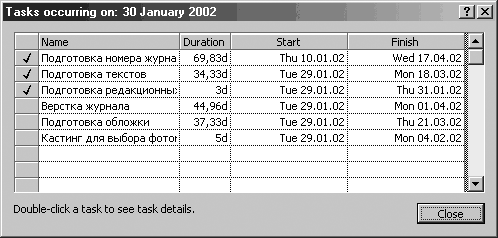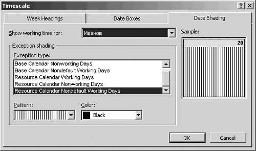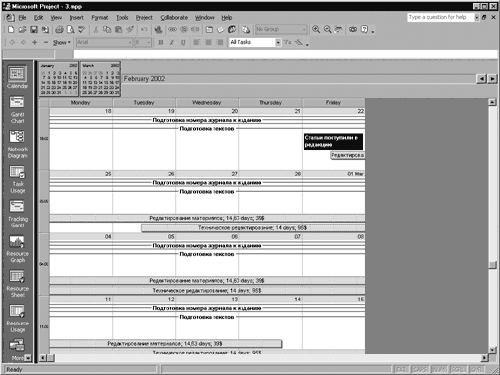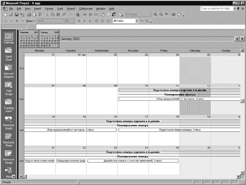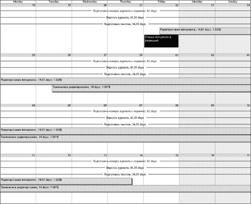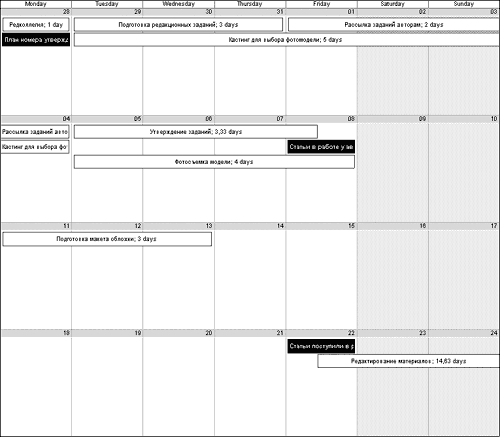 ОтрывокКалендарь и график ресурсовКалендарь - одна из основных диаграмм, которыми вы будете пользоваться при работе в MS Project, потому что с его помощью можно представить план работ в привычном для большинства сотрудников виде. В этом уроке вы узнаете, как настраивать отображение задач плана проекта на этой диаграмме. График ресурсов предназначен для анализа загрузки ресурсов. Вы узнаете, какую информацию можно получать с помощью этого представления и как его настраивать. Когда вы освоите тонкости работы с этим представлением, вы сможете получать все необходимые вам отчеты по ресурсам в рамках проекта. Календарь Диаграмма Календарь (Calendar) отображает информацию о плане проекта в виде таблицы с семью или пятью колонками, соответствующими дням недели, и множеством рядов, соответствующих неделям. Задачи на календаре обозначены отрезками, которые начинаются в день начала работ над задачей и заканчиваются в день их окончания (рис. 7.1, файл 1.mpp). ![]() Рис. 7.1. Диаграмма напоминает обычный календарь, на котором задачи отмечены отрезками, Диаграмма удобна тем, что представляет план проекта и задачи внутри него в традиционном календарном виде. MS Project содержит набор средств, позволяющих отформатировать календарь удобным способом, например чтобы его можно было распечатать и повесить на стену. Кроме того, на диаграмме можно редактировать план проекта. Форматирование календаря Принципы настройки календаря совпадают с принципами настройки диаграммы Ганта: можно отформатировать стили отрезков, шкалу времени, вспомогательные линии и общие параметры диаграммы. В отличие от диаграммы Ганта или сетевой диаграммы, на которых можно форматировать как отдельный отрезок, так и их группы (стили отрезков), на календаре можно форматировать только стили отрезков, а изменить параметры отображения одного отрезка для конкретной задачи нельзя. Форматирование стилей отрезков Для изменения параметров отображения отрезков на диаграмме предназначено диалоговое окно форматирования стилей отрезков (рис. 7.2, файл 2.mpp). Открыть его можно посредством команды меню Format4Bar Styles (Формат4Стили отрезков) либо с помощью команды Bar Styles (Стили отрезков) контекстного меню диаграммы. ![]() Рис. 7.2. Диалоговое окно форматирования стилей отрезков В левой части диалогового окна расположен список типов отрезков. После того как на один из пунктов в списке будет установлен курсор, в остальных разделах диалогового окна можно задавать параметры выбранного типа отрезков. В разделе Sample (Образец), расположенном внизу диалогового окна, можно увидеть, как будут выглядеть отрезки выбранного типа на диаграмме. Параметры, расположенные в разделе Bar shape (Форма отрезка), определяют форму и цвет отрезка на диаграмме. В списке Bar type (Тип отрезка) выбирается подходящая форма отрезка: Bar (Прямоугольник), Line (Линия) или None (Нет). Первый вариант - стандартная форма отрезка, как в диаграмме Ганта, при выборе второго варианта отрезок будет обозначен тонкой линией, а в третьем случае отрезок вообще не будет отображен на календаре. В списках Pattern (Узор) и Color (Цвет) определяются цвет фигуры и способ ее окраски. Список Split pattern (Прерывание) содержит варианты отображения перерывов во время выполнения задач. Наконец, флажок Shadow (Тень) определяет, будут ли отрезки на диаграмме иметь тень. В разделе Text (Текст) осуществл