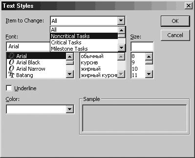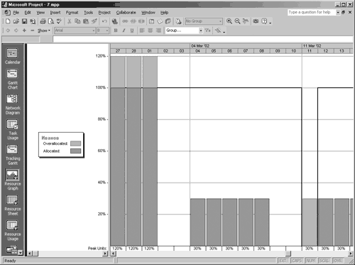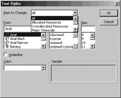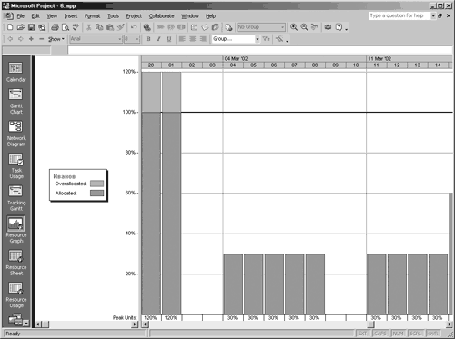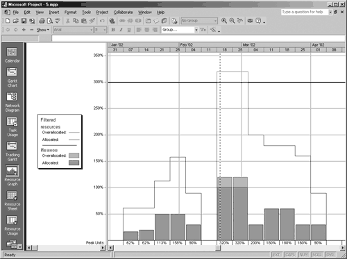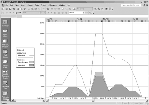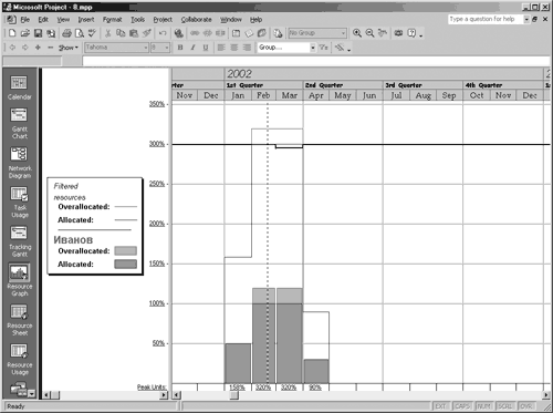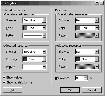 По умолчанию на графике отображается информация об одном ресурсе группы, общая же информация обо всех членах группы не выводится. Для того чтобы определить, каким образом должны отображаться данные о ресурсах, и вывести на график информацию о группе ресурсов, предназначено диалоговое окно форматирования диаграммы. Настройка параметров отображения данных на диаграмме Диалоговое окно форматирования ресурсного графика открывается с помощью команды меню Format4Bar Styles (Формат4Стили отрезков) или команды Bar Styles (Стили отрезков) в контекстном меню диаграммы. С помощью этого диалогового окна (рис. 7.17, файл 5.mpp) настраивается вид графика только для текущего типа данных, и для определенных типов некоторые из параметров недоступны. ![]() Рис. 7.17. Диалоговое окно форматирования ресурсного графика Диалоговое окно состоит из двух частей с одинаковыми разделами настроек. В левой части настраивается отображение данных для группы ресурсов, а в правой - для отдельного ресурса. Внизу диалогового окна расположены параметры, относящиеся к диалоговому окну в целом. Части диалогового окна, относящиеся к отдельному ресурсу и к группе, в свою очередь, состоят из двух одинаковых разделов настроек, верхний из которых содержит параметры, управляющие отображением на графике информации о перегрузке ресурса или группы ресурсов, а нижний содержит аналогичные параметры, касающиеся нагрузки. Таким образом, диалоговое окно содержит четыре однотипных раздела. Список Show as (Показывать как) содержит варианты отображения информации на диаграмме. При выбранном значении Don't Show (Не показывать) информация не выводится. Если выбрать значение Bar (Отрезок), данные отобразятся в виде отрезка, идущего снизу вверх (темные отрезки на рис. 7.15). Аналогично действует значение Step (Шаг) - в этом варианте между отрезками нет промежутков, из-за чего они сливаются, образуя ступени. А при выборе значения Step Line (Линия шага) отображаются только контуры отрезков, без заливки их цветом (например, на рис. 7.15 в таком режиме отображается информация о группе ресурсов). СОВЕТ. Чтобы данные для группы ресурсов или отдельного ресурса отображались на диаграмме, нужно выбрать способ отображения этих данных. Если же оставить значение Don't Show (Не показывать), то данные на диаграмме не появятся. В случае выбора значения Line (Линия) информация отображается в виде линии, соединяющей значения друг с другом. А в режиме, соответствующем значению Area (Область), значения также соединяются линиями, но при этом область между нижней осью диаграммы и линией закрашивается (рис. 7.18, файл 5a.mpp). ![]() Рис. 7.18. На диаграмме отображены те же данные, что и на рис. 7.15. Для того чтобы на нижней оси выводились численные обозначения, нужно установить флажок Show values (Показывать значения). Если при этом на диаграмме одновременно отображается несколько видов информации, то число на горизонтальной оси соответствует максимальному значению. Например, на рис. 7.18 отображены данные о нагрузке и перегрузке Иванова и общей нагрузке всей группы редакторов разделов. Соответственно, поскольку максимальные значения принадлежат графику нагрузки группы ресурсов, значения на оси соответствуют им. Чтобы соотнести данные для одного ресурса с их потенциальным максимальным значением, используется флажок Show availability line (Показывать линию доступности). После