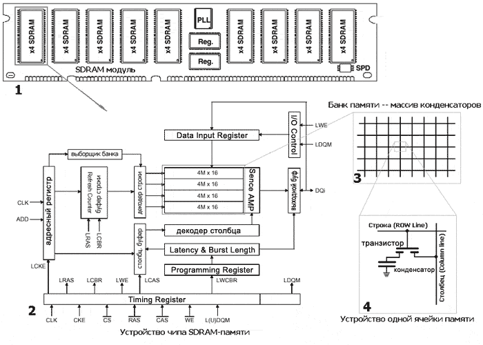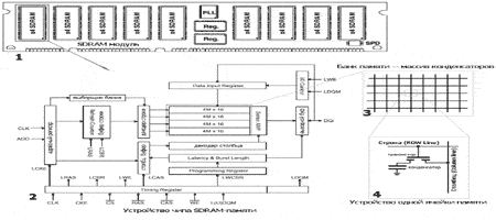 Рисунок 2 Схематическое изображение модуля оперативной памяти (1); микросхемы памяти (2); матрицы (3) и отдельной ячейки памяти (4).