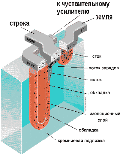 Конденсатору отводится роль непосредственного хранителя информации. Правда, хранит он очень немного - всего один бит. Отсутствие заряда на обкладках соответствует логическому нулю, а его наличие - логической единице. Транзистор же играет роль "ключа", удерживающего конденсатор от разряда. В спокойном состоянии транзистор закрыт, но, стоит подать на соответствующую строку матрицы электрический сигнал, как спустя мгновение-другое (конкретное время зависит от конструктивных особенностей и качества изготовления микросхемы) он откроется, соединяя обкладку конденсатора с соответствующим ей столбцом.