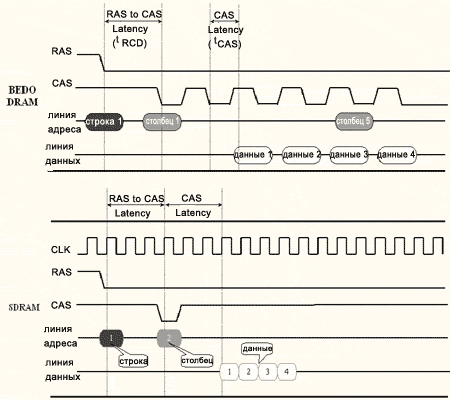 Задержка между подачей номера строки и номера столбца на техническом жаргоне называется "RAS to CAS delay" (на сухом официальном языке - tRCD). Задержка между подачей номера столбца и получением содержимого ячейки на выходе - "CAS delay" (или tCAC), а задержка между чтением последней ячейки и подачей номера новой строки - "RAS precharge" (tRP). Здесь и далее будут использоваться исключительно жаргонизмы - они более наглядны и к тому же созвучны соответствующим настойкам BIOS, что упрощает восприятие материала неподготовленными читателями.