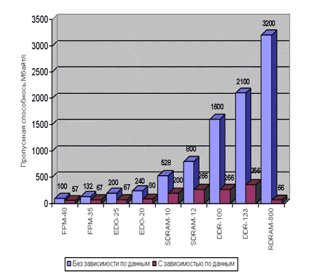 Рисунок 8 Максимально достижимая пропускная способность основных типов памяти при наличии зависимости по данным и при отсутствии таковой.