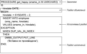 Откомпилированная программа Встроенные языки (Pro*C и т. п.); OCI (Oracle Call Interface) Анонимные блоки, встроенные в код программы и выполняемые сервером базы данных Когда вы связываете код PL/SQL с триггером или полем, пользуясь таким инструментальным средством, как Forms Builder, этот код составляет анонимный блок PL/SQL. При этом можно создать полный блок с объявлениями, исполняемыми операторами и разделом обработки исключений или же ограничиться только исполняемыми операторами. Именованные блокиБлок;именованныйХотя анонимные блоки PL/SQL применяются во многих приложениях Oracle, вероятно, большая часть написанного вами кода будет оформлена в виде именованных блоков. Ранее вы уже видели несколько примеров хранимых процедур (см. рис. 3.1) и знаете, что их главной особенностью является наличие заголовка. Заголовок процедуры выглядит так: Заголовок;процедуры