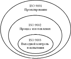 Три стандарта из серии ИСО 9000 (ИСО 9001, ИСО 9002 и ИСО 9003) являются фундаментальными документами Системы Качества, определяют методологию обеспечения качества и представляют собой три различные модели функциональных или организационных взаимоотношений между участниками системы качества (как правило "поставщик", "потребитель", "субконтрактор" или "субпоставщик"). Собственно именно по этим стандартам и проводится сертификация "поставщика" являющегося основным объектом управления качеством. Общие принципы и правила организации работ по сертификации систем качества в Российской Федерации определяет введенный в действие с 1 октября 1995 года национальный стандарт ГОСТ Р 40.001-95. Базовая серия (часто говорят - семейство) ИСО 9000 состоит из следующих стандартов (в списке вместе с международными стандартами ISO приведены их Российские ИСО аналоги, в некоторых случаях касающиеся только части базовых ISO требований): ISO 9000 "Общее руководство качеством и стандарты по обеспечению качества. Руководящие указания по выбору и применению" ГОСТ Р ИСО 9000-2:1993 "Общее руководство качеством и стандарты по обеспечению качества. часть 2: Общие указания по применению ИСО 9001, ИСО 9002, ИСО 9003" ISO 9001 "Системы качества. Модель для обеспечение качества при проектировании и\или разработке, монтаже и обслуживании." ГОСТ Р ИСО 9001:1994 ISO 9002 "Системы качества. Модель для обеспечение качества при производстве и монтаже." ГОСТ Р ИСО 9002:1994 ISO 9003 "Системы качества. Модель для обеспечение качества при окончательном контроле и испытаниях." ГОСТ Р ИСО 9003:1994 ISO 9004 "Общее руководство качеством и элементы системы качества. Руководящие указания." Кроме собственно 9000х стандартов в семейство входят и так называемые "поддерживающие" (вспмогательные) стандарты и "руководства" (стандарты документов и процессов), определяющие либо общие элементы 9000, либо наоборот, специфицирующие их на конкретные производственные и коммерческие ситуации. К поддерживающим стандартам относятся: ISO 10011 "Руководящие указания по проверке системы качества". ГОСТ Р ИСО 10011:1993 "Руководящие указания по проверке систем качества." ПР 50.3.001-94 "Правила сертификации. Система сертификации ГОСТ Р. Требования к экспертам и порядок их аттестации." ISO 10012 "Требования, гарантирующие качество измерительного оборудования" Базовые понятия и термины качества определены в стандарте ISO 8402 "Управление качеством и обеспечение качества - Словарь" (именно в этом стандарте собственно и определено понятие "качество") Руководства можно разделить по направлениям: Подготовка руководства по качеству (Quality manual) и другой документации - ISO 10013 ("Руководящие указания по разработке руководств по качеству") и ISO 10016. Подготовка персонала и управления, проектирование - ISO 1005, ISO 1006, ISO 1007, ISO 10014, ISO 10015. Руководящие и специфические требования: ISO 40001, ISO 40002, ISO 13485 и другие и соответственно ГОСТ Р 40.001-96, ГОСТ Р 40.002-96, ГОСТ Р 40.003-96, ГОСТ Р 40.004-96, ГОСТ Р 40.005-96 и другие. Получившая система стандартов (точнее ее подмножество - 9001-9003) обладает определенной вложенностью, то есть каждый последующий стандарт определяет систему качества для более узкой области нежели предыдущей. Стандарты 9000 и 9004 определяю общие требования к системе качества и модели управления качеством.