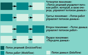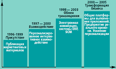 Хорошо известна классификация электронного бизнеса, предложенная компанией Gartner Group (рис. 1). Она делит его на четыре фазы развития: присутствие, взаимодействие, передача данных (транзакции) и трансформация бизнеса. Начиная с 2000 года, активно развиваются третья и четвертая фазы. Есть менее известная, но более содержательная и тоже четырехуровневая классификация этапов развития электронного бизнеса, предложенная Дэйвом Фишером из компании i2 (рис. 2).