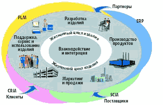 Если перевести обсуждение в категории управления знаниями, то одной из важнейших задач в этом цикле является перевод знаний, скрытых в умах всех занятых в нем сотрудников, в явные знания, заключенные в форму документации на механические изделия, электронные компоненты, программное обеспечение, описание сервисных процедур и т.д. Процесс перевода и накопления непрерывен, он служит формированию интеллектуального капитала компании. (Вопросы, связанные с интеллектом и управлением знаниями выходят за рамки обсуждения PLM, но сегодня они становятся критически важными, в частности, в области разработки программного обеспечения. В софтверных компаниях, в том числе, в гигантах наподобие Microsoft или Oracle, не имеющих практически никакой производственной базы, подавляющую часть стоимости составляет именно интеллектуальный капитал.) Поверх первого цикла накручивается второй — производственный; он включает все, что связано с выпуском и распределением выпущенной продукции. Основными приложениями, реализующими функции этого цикла, являются системы управления ресурсами предприятия (ERP). Внешний, операционный цикл поддерживают системы управления финансами, кадрами и другими ресурсами (CRM, SCM и др.). Одно из наиболее полных определений PLM [5] состоит из четырех пунктов: