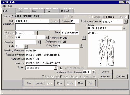 Рис. 1. Общая схема взаимосвязи автоматизированных систем виртуального предприятия Функциональные возможности системы Vertex ApparelСистема обладает полным набором функциональностей PDM-системы последнего поколения. Управление данными о модели и о ее составе. В системе хранится вся относящаяся к конкретной модели одежды информация, требуемая в разное время для различных категорий пользователей. Так, дизайнер еще при предварительном отборе ткани для модели может воспользоваться как ранее введенными сведениями о ее свойствах, так и занести новые. В систему вводятся и хранятся сведения о составе модели, ее компонентах, технических характеристиках и составе используемых тканей, фурнитуре, пряже. Данные об исходном сырье ведутся как в терминах фабрики-поставщика, так и в терминах, принятых в компании-операторе. Система также обеспечивает возможность быстрого оформления заказа на ткань для пошива образцов модели. Причем, не обязательно при этом находиться в оффисе компании, можно быть на презентации тканей или на ткацкой фабрике - эти функции достижимы через глобальную сеть Internet при наличии у пользователя соответствующих прав. Порожденный дизайнером эскиз модели может импортироваться из CAD/CAM-системы в любом из распространенных графических форматах: jpg-, gif-, bmp-, tif- и т.п. форматах. Предусмотрено хранение всех вариантов графических образов модели и сопровождающей их дополнительной информации. Далее эскиз модели используется как при ведении информации о модели (Рис. 2), так и в формируемых системой отчетах (Рис. 3 и Рис. 4).